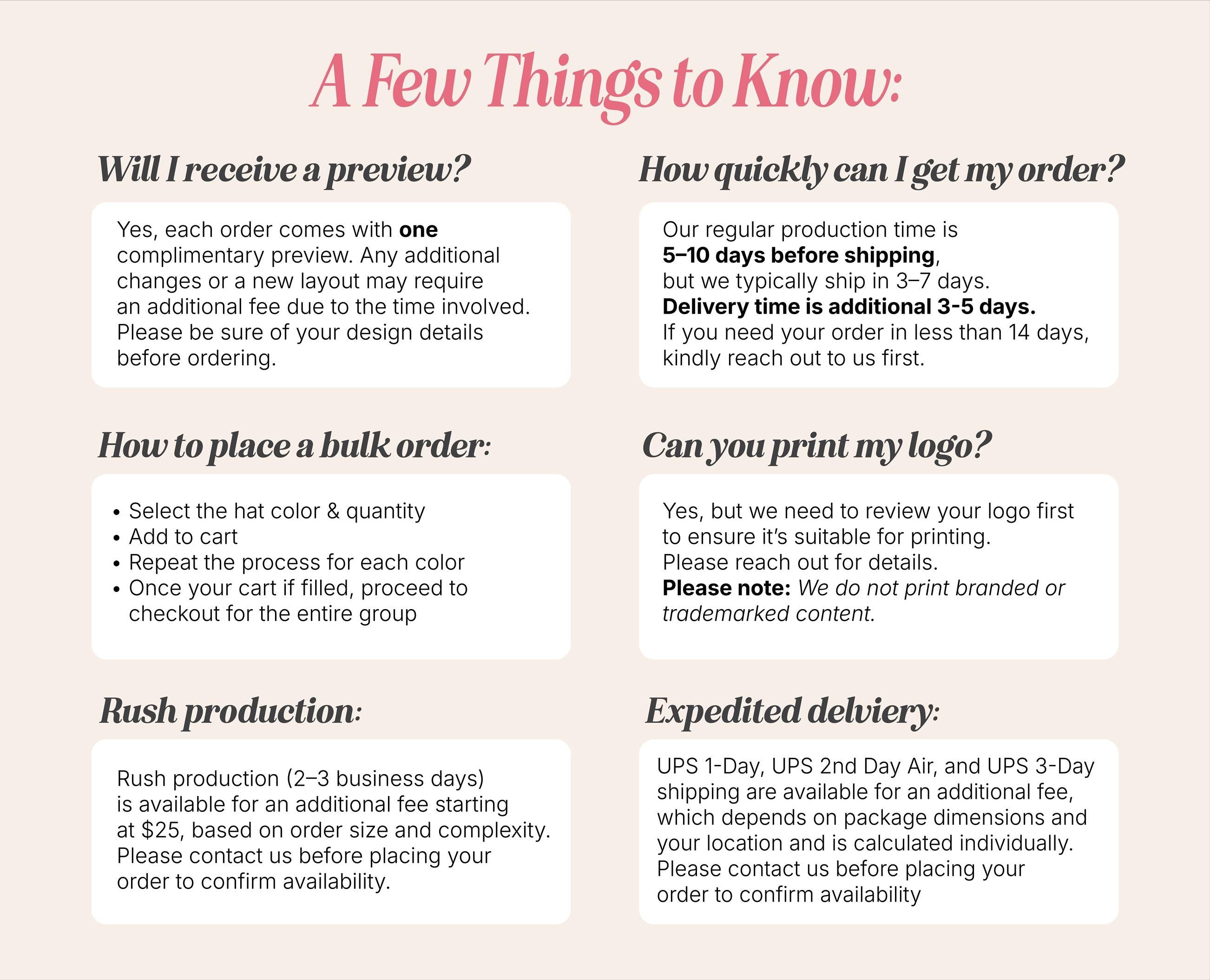 Custom hats are subject to approval. Please keep an eye out for a design mockup within 24 hours of placing your order. If the design isn’t approved within 24 hours, the order will either be processed as shown or, if there are any concerns about the design, it will be canceled and refunded.